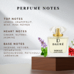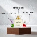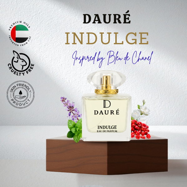 Dauré INDULGE is a modern, captivating fragrance inspired by the timeless allure of Bleu de Chanel. This scent opens with a fresh and zesty burst of lemon, grapefruit, and mint, complemented by a spicy touch of pink pepper—an energizing introduction that instantly grabs attention.
